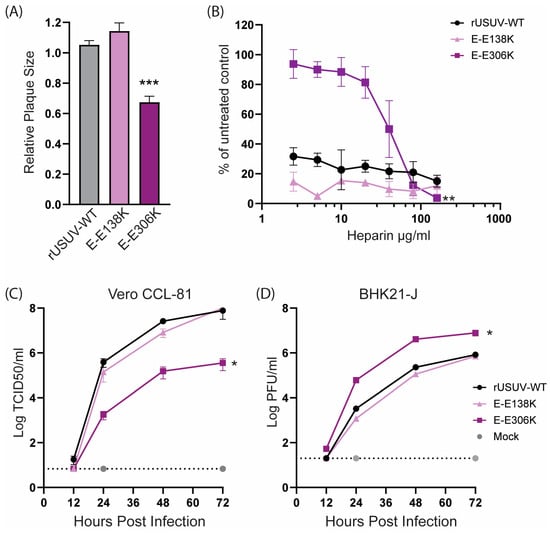 Cell culture phenotype of the engineered USUV envelope mutants rationally designed to enhance glycosaminoglycan (GAG) binding. (A) Plaque diameters of mutant viruses normalised to the average diameter of the rUSUV-WT plaques on BHK21-J cells. Statistical analysis was performed using unpaired t-test. (B) Heparin inhibition in a dose–response assay on BHK21-J cells. Sensitivity of the inhibition is shown as percentage of plaques formed in treated cells relative to untreated control. Replication kinetics on (C) Vero CCL-81 and (D) BHK21-J cells infected with rUSUV-WT or E-E138K and E-E306K mutant viruses. Infectious virus titres in cell culture supernatants harvested at specified timepoints were determined by TCID50 or plaque assay. Statistical analysis was performed using one-way ANOVA. * p < 0.05, ** p < 0.01, *** p < 0.001.