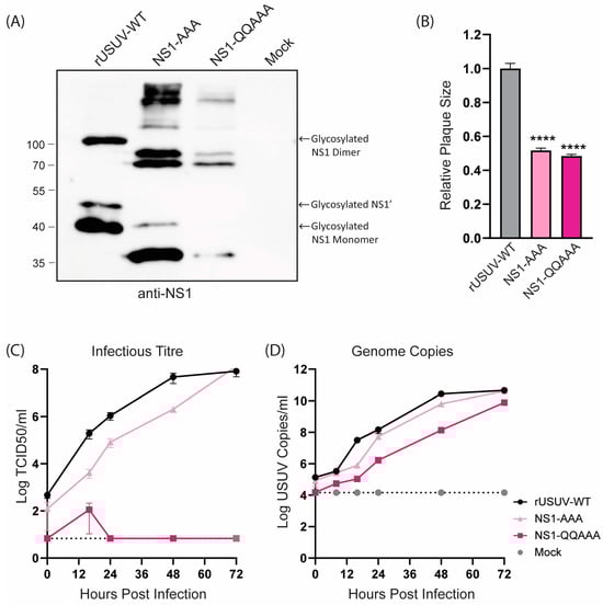 Phenotype of engineered USUV NS1-glycosylation mutants in cell culture. (A) Western blot of protein lysates harvested at 48 hpi from Vero CCL-81 cells infected with rUSUV-WT or mutant viruses treated with anti-NS1 antibodies. (B) Plaque diameters of mutant viruses normalised to average diameter of rUSUV-WT plaques on BHK21-J cells. Statistical analysis was performed using unpaired t-test. Replication kinetics on (C) Vero CCL-81 and (D) A549 cells infected with rUSUV-WT or NS1-AAA and NS1-QQAAA mutant viruses. Titres were determined by TCID50 or plaque assay on cell culture supernatants harvested at specified timepoints. **** p < 0.0001.