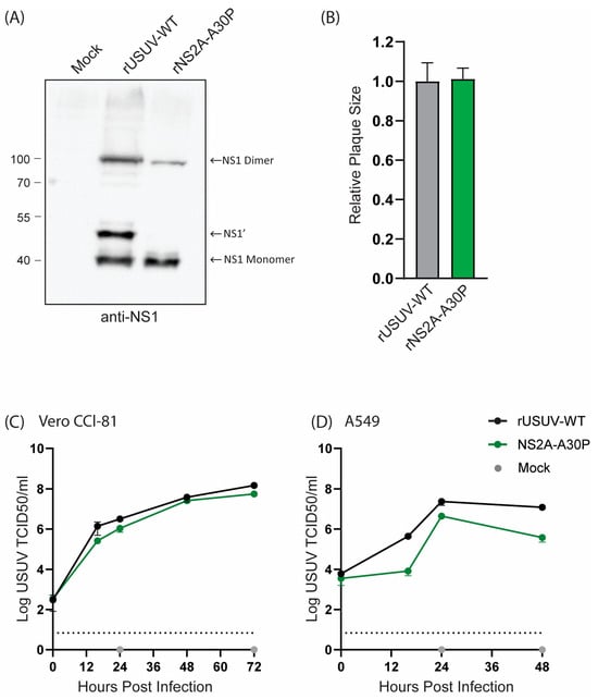 Cell culture phenotype of USUV NS2A-A30P mutant. (A) Detection of NS1’ and NS1 protein from Western blot of 48 h lysates from Vero CCL-81 cells infected with rUSUV-WT or mutant virus. (B) Plaque diameters of mutant viruses normalised to average diameter of rUSUV-WT plaques on BHK21-J cells. Statistical analysis was performed using unpaired t-test. Replication kinetics on (C) Vero CCL-81 and (D) A549 cells infected with rUSUV-WT or NS2A-A30P mutant virus. Titres were determined by TCID50 assay from cell culture supernatants harvested at specified timepoints.