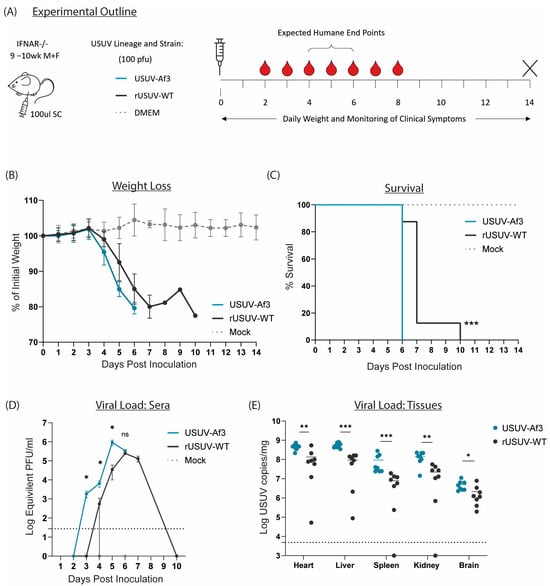All our mutant viruses were derived from the USUV-Af-3 full-length recombinant cDNA clone, and therefore we first compared the parental rUSUV-WT virus to the natural isolate USUV Af-3-NL in our animal model. Because immunocompetent mice do not support (robust) USUV infection after peripheral inoculation, we used Ifnar−/− mice, which lack IFN α/β receptors. The mice were injected SC with clone-derived (rUSUV-WT) virus, natural isolate (USUV-Af-3) virus, or DMEM only. Mice were monitored for weight as well as clinical symptoms and bled on alternating days to assess viremia (Figure 6A). The mice infected with the clone-derived virus displayed a delay in weight loss and longer average survival time by approximately 1 day (Figure 6B,C). A single mouse from the rUSUV-WT-infected group showed a recovery of weight loss after day 7 (when all other mice had succumbed); however, this mouse became moribund and needed to be sacrificed by day 10. The increase in viremia was also delayed in the rUSUV-WT-infected mice, and the peak titres reached by the clone-derived virus were around 3-fold lower than those measured for the corresponding natural isolate (Figure 6D). Reduced virus titres were also found in the tissues harvested at the humane endpoint (HEP), showing a 3- to 10-fold reduction in viral copy numbers across the heart, liver, spleen kidney, and brain (Figure 6E).