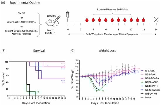 The mutations that caused attenuated phenotypes in vitro (E-E306K, NS1-AAA, NS1-QQAAA, NS2A-A30P, NS4B-P41G, NS4B-D252G) were assessed in the Ifnar−/− mouse model (Figure 7A). With the exception of the NS2A-A30P mutant, the attenuating mutations all caused statistically significant increases in survival percentage and average survival time and delayed the onset of clinical symptoms in comparison to the animals inoculated with the wild-type virus (Figure 7B,C, Table 2).