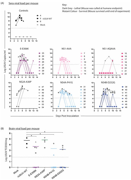 Viral loads in sera and brain tissue of mice infected with WT and mutant USUV. Bleeds and relevant tissues were harvested from Ifnar−/− mice infected with rUSUV-WT or mutant viruses, as described in Figure 7. (A) Viral titre of tail bleeds and final heart bleed sera from control (rUSUV-WT and mock) and mutant-virus-infected mice, measured by RT-qPCR and absolute quantification using a reference standard. (B) USUV TCID50/mg of homogenised brain tissues harvested at humane endpoint (HEP) or end of experiment. Statistical analysis was performed using Mann–Whitney test. Limit of detection represented as dotted grey line. * p < 0.05.