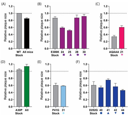 To further assess whether reversion was occurring, we analysed the plaque phenotypes of the viruses from homogenised brain tissue. The viruses isolated from the samples that had reverted to the wild type should have had plaque sizes more similar to the rUSUV-WT control, while the virus samples without reversion should have retained the phenotype of the mutant stock virus. The plaques from the rUSUV-WT-infected animals were around 80% of the size of the stock virus (Figure 9A). The two E-E306K animals that mutated to an Asn had a smaller plaque phenotype than the stock virus (60% relative plaque size compared to 80% relative plaque size), while the Lys to Glu revertant samples showed a similar plaque phenotype to the rUSUV-Af3-infected mice (~80% relative plaque size) (Figure 9B). The NS1-QQAAA brain plaques from the single mouse that succumbed in this group were larger than the mutant rNS1-QQAAA stock but still much smaller than the WT virus stock (Figure 9C). The NS2A-A30P virus stock plaque size was similar to the wild-type virus, and, consistent with this, the brain tissue plaques showed no change in phenotype (Figure 9D). The P41G-infected animals showed the same plaque size as the mutant stock, which was ~60% of the wild-type virus (Figure 9E). The plaques from the four D252G-infected animals appeared to maintain the mutant virus plaque phenotype (Figure 9F).