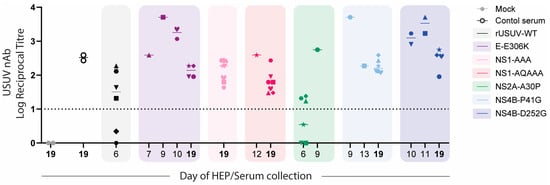 USUV neutralisation by sera obtained from mice infected with WT or mutant USUVs. Virus neutralisation assays were performed on sera collected from mice at HEP or from mice at end of experiment (day 19, in bold). GMTs (geometric mean titres) of neutralising responses against USUV are shown for mock and positive control sample (pooled serum sample collected from USUV-Af3 infected Ifnar−/− mice on day 14, n = 2), rUSUV-Af3 (2 replicate experiments), and each of mutant viruses. Neutralisation titres at timepoints indicated on x-axis are shown for each mutant (coloured boxes). Symbol shape represents each individual mouse (1 through 8 per group) as shown in Figure 8.
