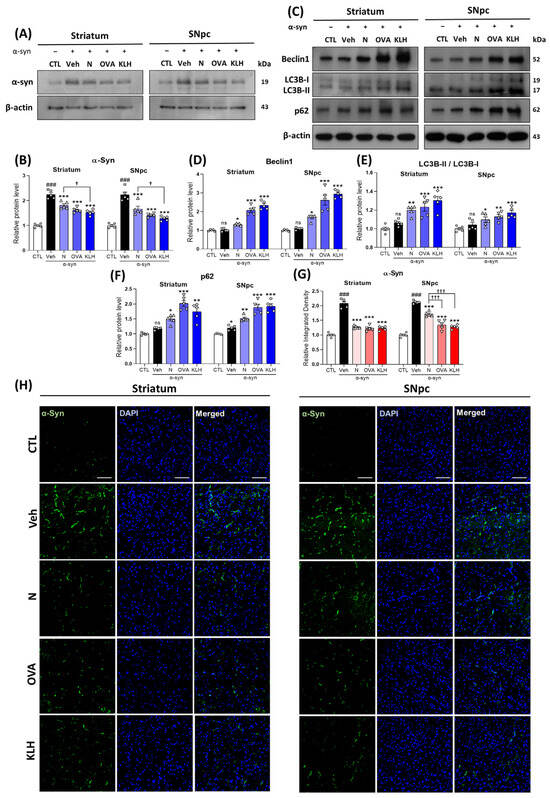 Epitope treatment reversed the α-syn and autophagy levels in the brain. (A,B) Western blot analysis showing the expression of α-syn in the striatum and SNpc (n = 5 per group). (C–F) Western blot analysis showing the expression of autophagy-related markers, i.e., (D) beclin-1, (E) LC3B-II/I, and (F) p62 in the striatum and SNpc (n = 5 per group). (G,H) Immunofluorescence staining measuring the expression of α-syn (green) co-stained with DAPI (blue) in the striatum and SNpc (n = 5 per group). Scale bar present 50 μm. Comparisons: # control (CTL) with saline-treated (Veh) α-syn-induced PD model; * Veh group with epitope treated group [non-carrier protein (N) and carrier-protein (OVA and KLH); † Non-carrier protein (N) with carrier protein (OVA and KLH). Data are presented as mean ± SEM. */† p < 0.05, ** p ≤ 0.01, ###/***/††† p ≤ 0.001, and non-significant (ns).