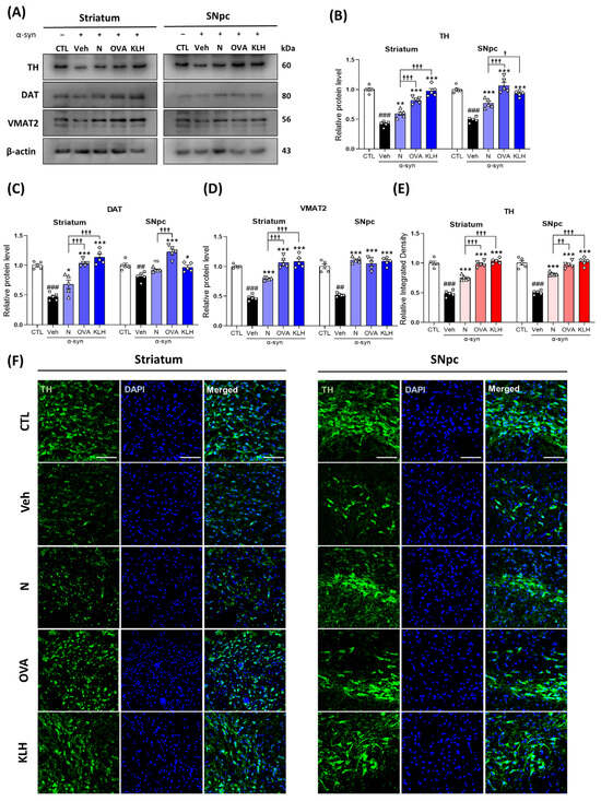 Epitope treatment increased dopamine-related markers in the brain. (A–D) Western blot analysis measuring the expressions of (B) tyrosine hydroxylase (TH), (C) dopamine transporter (DAT), and (D) vesicular monoamine transporter 2 (VMAT2) in the striatum and SNpc (n = 5 per group). (E,F) Immunofluorescence staining measuring the expression of TH (green) co-stained with DAPI (blue) in the striatum and SNpc (n = 5 per group). Scale bar present 50 μm. Comparisons: # control (CTL) with saline-treated (Veh) α-syn-induced PD model; * Veh group with epitope-treated group [non-carrier protein (N) and carrier-protein (OVA and KLH); † Non-carrier protein (N) with carrier protein (OVA and KLH). Data are presented as mean ± SEM. */† p < 0.05, **/†† p ≤ 0.01, ###/***/††† p ≤ 0.001, and non-significant (ns).