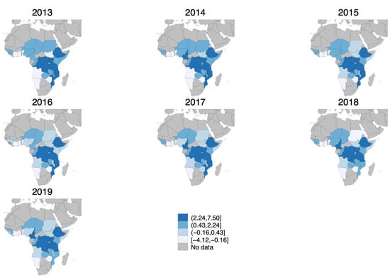 Figure 1 depicts how the cholera risk index changed over the study period. From 2013 to 2019, cholera risk in Africa shifted from west to east, with the Central and Eastern regions experiencing persistently higher cholera risk, while West Africa generally saw declining outbreaks.