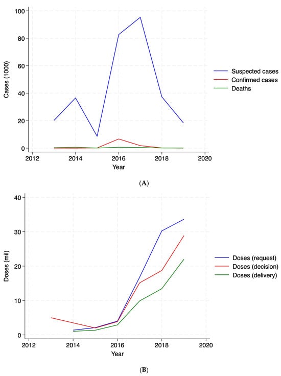 9] to investigate how OCVs were allocated across 25 countries in Africa between 2013 and 2019. For the analysis, we selected African countries that either had an outbreak recorded or a request, decision or delivery of OCVs in the datasets over the study period (
