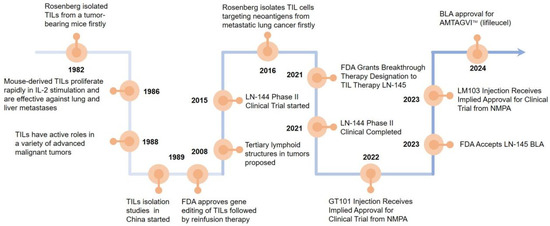 Steven Rosenberg’s group first used TILs to treat tumor-bearing mice and found that the therapeutic potency of TILs was 50–100 times higher than that of lymphokine-activated killer cells in 1986 [5]. In 1988, more studies reported that TILs have active roles in a variety of advanced malignant tumors [6]. In 2008, it was suggested that tertiary lymphoid structures (TLSs) are present in the tumor tissue. The formation of TLSs symbolizes the infiltration of immune cells and the enhancement of their tumor-killing effect, which is a positive factor for patient survival and prognosis, promoting tumor lymphocyte infiltration [7]. In 2015, LN-144 began clinical phase II trials to the end of the trial in 2021 [8]. In 2021, the FDA granted breakthrough therapy designation to TILs therapy LN-145 [9]. The FDA granted accelerated BLA approval for AMTAGVI™ on February 16, 2024 with a price of USD 515,000 per dose, which is the first TILs therapeutic regimen for advanced melanoma that has progressed following PD-1/PD-L1 therapy worldly. After 2020, China’s TILs injectable products gradually enter the clinical trial phase. In 2021, GT101 Injection from GRIT Biotechnology (CXSL2200061) first received implied clinical trial approval from the National Drug Administration (NMPA), GC101 TIL injection (CXSL2200070), and LM103 TILs (CXSL2300304) received implied clinical trials approvals from the NMPA subsequently. Excitingly, GT101, the fastest progressing TILs product in China, is expected to be on the market by the end of 2025 (Figure 1).