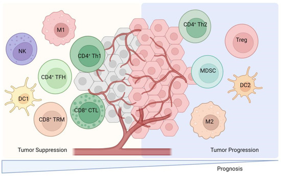TILs are lymphocytes that have been isolated from tumor tissue and exhibit a high degree of heterogeneity among immune cell subpopulations. These subpopulations predominantly include CD8+ cytotoxic T lymphocytes, CD4+ T cells, dendritic cells (DCs), and natural killer T (NKT) cells, which are primarily associated with positive immune responses. Conversely, certain TILs, such as tumor-associated macrophages (TAMs), regulatory T cells (Tregs), and myeloid-derived suppressor cells (MDSCs), play a role in negatively regulating immune responses (Figure 2). These cells secrete a variety of cytokines and growth factors, including interleukin-6 (IL-6), IL-10, vascular endothelial growth factor (VEGF), and transforming growth factor-beta (TGF-β). The secretion of these factors inhibits the activation of DCs, CD8+ cytotoxic T lymphocytes, and NK cells, thereby facilitating tumor cells’ evasion of immune surveillance and contributing to tumor development, invasion, and metastasis [4]. A comprehensive review of the functions of TILs is presented as follows.
