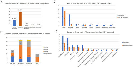 Status and regional disparities in clinical studies of TILs therapies. (A) The current status of all TIL clinical trials. (B) Number of clinical trials on TILs therapy worldwide by year and clinical stage. (C) Number of the geographic localization of TIL clinical trials worldwide. (D) Number of TIL clinical trials on different tumor type. The numbers of trials in each category followed by its percentage among total trials is shown. Data were obtained from Clinical Trials.gov.