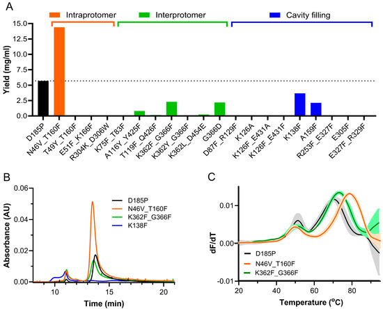 Figure 1A summarizes the specific mutations and stabilization strategies of the twenty A2 based designs and compares their yields to the A2 based pre-F benchmark. In all, 6 of the 20 designs (at least 1 for each stabilization strategy) showed some level of expression, with the N46V_T160F construct achieving a yield of 14.4 mg/L, which is considerably higher than the pre-F benchmark, while the K138F and K362F_G366F designs achieved the next highest expression. The stabilization strategies, as exemplified by the highest yielding constructs and the D185P benchmark, are illustrated in Figure S2.