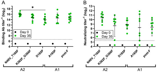 A mouse study was next performed to compare the immunogenicity of the N46V_T160F and G366F_K362F constructs to the D185P benchmark. As this proline mutation was originally described in the A1 background, the A185P (A1 based) pre-F benchmark was also included to ensure full comparability to published data, as was the A1 based post-F benchmark. The hMPV post-F benchmark has been reported to be a mixture of both pre-F and post-F [26] and was therefore heat treated at 70 °C for 10 min to fully convert it to the post-F state [25] prior to inoculation into the mice. Nevertheless, the A1 based pre-F and post-F constructs induced similar levels of binding (Figure 2A) and neutralizing (Figure 2B) Ab titers, possibly due to the dense glycosylation at the apex of hMPV pre-F, which shields site Ø from the immune response [25]. This shielding has been proposed to result in a broader nAb response across all hMPV antigenic sites than is the case with RSV [25], where site Ø is immunodominant. Among the A2 constructs, N46V_T160F induced a 4.1-fold, statistically significantly higher (p = 0.0287) geometric mean binding Ab titer and a 2.9-fold higher geometric mean nAb titer on Day 35 than the D185P benchmark, although the latter difference did not achieve statistical significance. The geometric means of the binding and neutralizing Ab titers induced by N46V_T160F were likewise higher than those induced by the A185P benchmark. Further, the N46V_T160F immunized animals showed least variability in both binding and nAb titers, as compared to other groups.