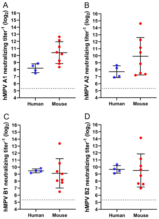 Cross-neutralization assessment of N46V_T160F immunized mouse sera. NAb titers in Day 35 sera of the eight were mice determined against prototype hMPV strains from subtypes (A) A1 (NL/1/00), (B) A2 (NL/17/00), (C) B1 (NL/1/99), and (D) B2 (NL/1/94) via PRNT60 assays. Four replicates of an in-house generated adult human sera pool were tested in each assay as an intra- and inter-assay control and internal neutralization benchmark. Dashed lines represent lower limits of quantification. Error bars represent one geometric standard deviation from the geometric mean.