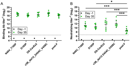 Evaluation of the immune response to the N46V_T160F pre-F construct and additional benchmarks in mice. Groups of eight mice were intramuscularly immunized with 0.5 µg of the indicated hMPV F constructs adjuvanted with Alhydrogel and boosted with the same regimens 21 days post-prime. Blood was collected one day prior to the first (Day −1) and 2 weeks after the second (Day 35) immunization. (A) hMPV pre-F binding Ab titers were determined by ELISA. (B) NAb titers were determined by microneutralization against hMPV subtype A2 strain expressing GFP. Day −1 samples were run as group pools. Dashed lines represent lower limits of quantification. Error bars represent one geometric standard deviation from the geometric mean. * = p < 0.05, *** = p < 0.001.