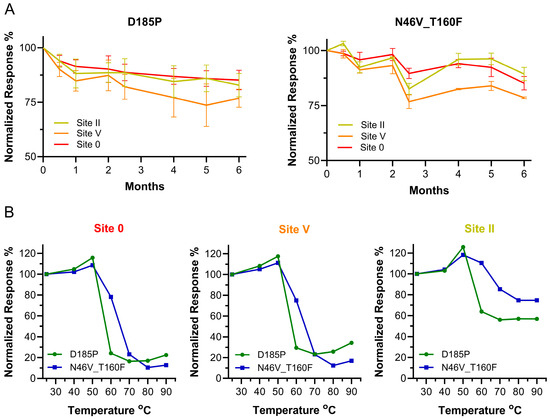 Last, the epitope integrity of hMPV F was examined under two temperature stresses. First, N46V_T160F and D185P, as a control, were stored at 4 °C for up to 6 months. The constructs were aliquoted and the aliquots flash-frozen at intervals, stored at −80 °C, and then all samples were assessed in BLI to evaluate retention of site specific mAb binding (Figure 6A). A panel of three mAbs binding to three different sites was selected, 338 binding to site II, San27-14 to site V, and San32-2 to site Ø, and binding levels were normalized to Day 0 samples. Both constructs retained similar binding of pre-F specific SAN27-14 and SAN32-2 mAbs at 6 months, relative to the Day 0 samples, and showed similar decreases in mAb 338 binding, whose epitope is present on both the pre- and post-F forms. Final retention of binding for D185P was 82.8%, 76.8%, and 85.2% and 89.4%, 78.5%, and 85.2% for N46V_T160F, for sites II, V, and Ø, respectively.
