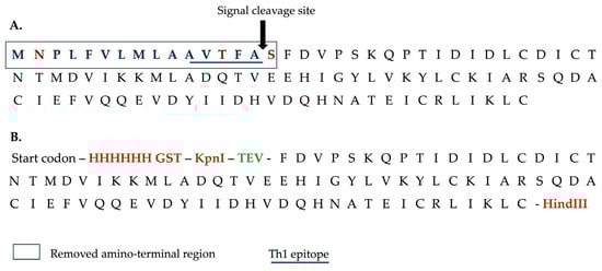 Strategy for cloning a modified version of recombinant FhSAP-2. (A) Sequence of 101 amino acids of FhSAP-2 (11.5 kDa) as reported in GenBank (Accession No. AF286903). The box over the first 16 amino acids represents the removed amino terminal region in mFhSAP-2, containing hydrophobic (blue) and hydrophilic (red) residues, along with a predicted signal peptide cleavage site between Ala15 and Ser16 (arrow). The amino acid sequence 11AVTFA15 (underlined) represents one of the two dominant Th1 epitopes of FhSAP-2. (B) The mFhSAP-2 fusion protein sequence lacks the initial 16 amino acids and the dominant Th1 epitope. A 6His tag and a GST tag (red) were added at the amino terminus to facilitate detection and purification, respectively, and Kpnl and Hind-III restriction sites (brown) were added to mFhSAP-2 for cloning into the pET30a (+) vector. A TEV protease cleavage site (green) was also added at the amino terminus to allow the removal of the His-GST tag after purification.