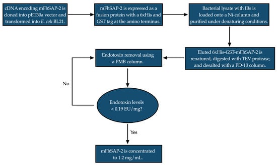 The expressed protein was extracted from the bacterial inclusion bodies using denaturing buffers and purified using a HiTrap Chelating HP column (Cytiva, Marlborough, MA, USA) as previously described []. The synthesis of cDNA, cloning, expression and purification was performed in collaboration with GenScript, USA (Order # U091CFK120). A flowchart showing a simplified sketch of the protein purification process is provided in Figure 2. After elution, the recombinant fusion protein was renatured, digested, and subjected to exhaustive cycles of endotoxin removal using polymyxin B (PMB) columns according to the manufacturer’s instructions. Endotoxin levels were assessed using a Chromogenic Limulus Amebocyte Lysate (LAL) assay (Lonza, Walkersville, MD, USA). Finally, mFhSAP-2 was concentrated using AMICON Ultracentrifugal Filters (YM-3), and its concentration was adjusted to 1.0 mg/mL, as determined by the BCA method. The purity of the protein was estimated through a densitometric analysis of a Coomassie blue-stained SDS-PAGE gel under reducing conditions. A detailed technical description of the purification process, including the buffer composition, enzyme treatments, and chromatography, is provided as supplementary data (Supplementary Material Data S1).
