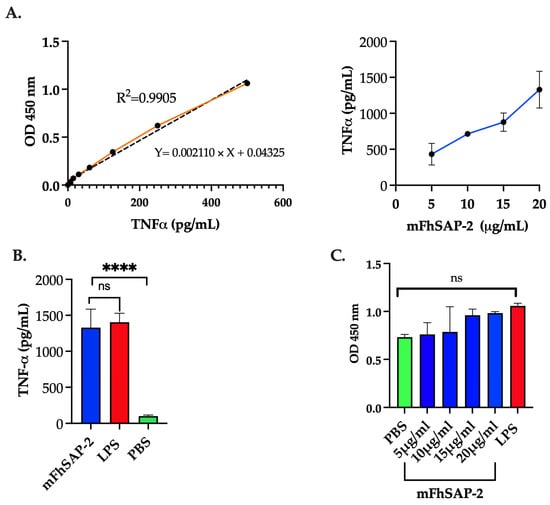 TNFα secretion and cell viability in RAW 264.7 cells treated with mFhSAP-2. RAW264.7 cells are macrophage-like cells of murine origin. Cells were seeded in an RPMI medium at a concentration of 5 × 105 cells/mL and stimulated with increasing concentrations of mFhSAP-2 (5 to 20 μg/mL). Cells stimulated with LPS (10 μg/mL) were used as an activation control, and cells treated with PBS were used as a negative control. (A) Orange line represent the OD 450nm values for each TNFα concentration of the standard curve. Dashed line shows the lineal correlation between known TNFα concentrations (x-axis) and OD450 values (y-axis). (B) Dose–response curve (showed in blue color) showing TNFα secretion in response to mFhSAP-2 in RAW 264.7 cells. TNFα secretion in RAW 264.7 cells treated with mFhSAP-2 (20 μg/mL), LPS (10 μg/mL), and PBS (negative control). (C) Cell viability assay in RAW 264.7 cells treated with PBS, mFhSAP-2, or LPS (10 μg/mL). OD values equal to or above PBS (negative control) indicate high cell viability and metabolic activity. Data are presented as mean ± SEM. Statistical significance was determined using unpaired t-tests: **** p < 0.0001 and ns: not significant.