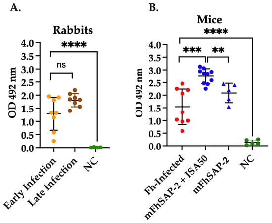 As shown in Figure 5, sera from rabbits and mice experimentally infected with F. hepatica exhibited a strong total specific IgG response against mFhSAP-2. There were no significant differences (ns) in the average OD492 values between the rabbit sera between early (1.288 0.581) and late infection (1.809 0.236) (Figure 5A). The average OD492 observed in infected mice was 1.614 0.665, suggesting that both rabbits and mice produced comparable levels of specific IgG antibodies against mFhSAP-2 during active F. hepatica infection. Statistically significant differences were found between the mouse group immunized with mFhSAP-2+ISA50 (average OD492 = 2.750 0.280) and the infected group (p = 0.0003). However, no significant differences were found between the F. hepatica-infected and mFhSAP-2-immunized mice. Moreover, the group immunized with mFhSAP-2+ISA50 also showed significantly higher specific IgG levels than the group immunized with mFhSAP-2 alone (p = 0.0026, average OD492 = 2.086 0.344) (Figure 5B). In contrast, antibody levels in control rabbits (average OD492 = 0.007 0.007) and control mice (average OD492 = 0.136 0.084) were close to the assay background.