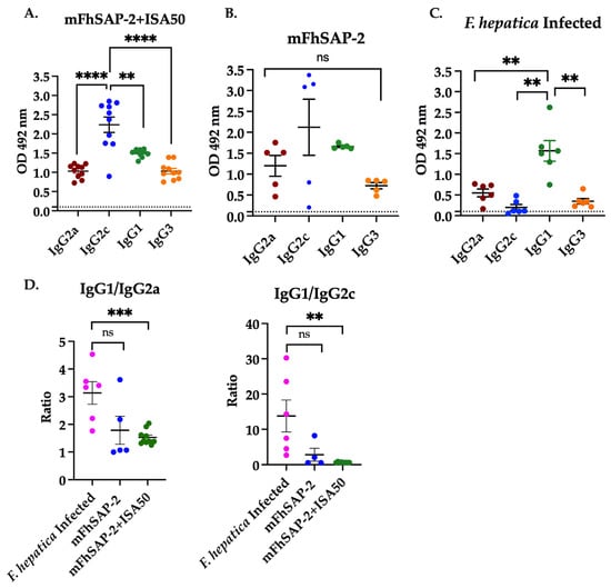 IgG subtype profile induced by mFhSAP-2 in C57BL/6 mice compared to F. hepatica infection. ELISA was used to assess the IgG profile against mFhSAP-2 in C57BL/6 mice immunized with mFhSAP-2 or mFhSAP-2+ISA50 or infected with F. hepatica. (A) mFhSAP-2+ISA50 induced significantly higher IgG2c levels than IgG2a (**** p < 0.0001), IgG1 (** p = 0.0032), or IgG3 (**** p < 0.0001). (B) mFhSAP-2 also induced higher IgG2c levels than other subtypes, but the differences were not statistically significant (ns). (C) F. hepatica infection induced significantly higher IgG1 levels than IgG2a (** p = 0.0034), IgG2c (** p = 0.0040), or IgG3 (** p = 0.0016). Dashed lines in (A–C) indicate the cut-off values (OD > 0.1) for all IgG isotypes established by the average OD492 3 SD of the negative control animals. (D) F. hepatica-infected mice had significantly higher IgG1/IgG2a (*** p = 0.0002) and IgG1/IgG2c (** p = 0.0053) ratios than those immunized with mFhSAP-2+ISA50, whereas differences with those immunized with mFhSAP-2 alone were not significant (ns). Data are presented as mean ± SEM. Statistical significance was determined using unpaired t-tests. Dotter line in the figures (A–C) represent the positive cut-off value for each antibody isotype.