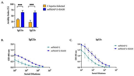 Mice immunized with mFhSAP-2+ISA50 had high-avidity IgG2a and IgG2c antibodies (AI > 50%), while mice infected with F. hepatica had intermediate-avidity IgG2a antibodies (AI between 30% and 50%) and low-avidity IgG2c antibodies (AI < 30%) (Figure 7A, Table 2). Moreover, the mean serum antibody titers in both mFhSAP-2- (Figure 7B) and mFhSAP-2+ISA50-immunized groups (Figure 7C) showed lower IgG2a end-point titers (1:1600 and 1:6400, respectively) compared to IgG2c titers (1:3200 and 1:25,600, respectively).