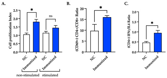 Splenocytes from immunized (mFhSAP-2+ISA50) and naïve mice were stimulated ex vivo with mFhSAP-2 or left unstimulated. Splenocytes from immunized mice, which were non-stimulated ex vivo, exhibited an average cell proliferation index (CPI) of 1.809 ± 0.142, which was significantly higher (p = 0.0176) than the average CPI of non-stimulated splenocytes from naïve mice. However, splenocytes from immunized mice that were stimulated ex vivo with mFhSAP-2 exhibited a CPI of 1.449 ± 0.138, which was not significantly different from that exhibited by splenocytes from naïve mice stimulated with mFhSAP-2 (1.147 ± 0.091) (Figure 8A). Additionally, the cytokine production and activation status of T helper cells (CD4+) and cytotoxic T cells (CD8+) of mice immunized with mFhSAP-2+ISA50 were determined using flow cytometry. Splenocytes from immunized mice stimulated ex vivo with mFhSAP-2 were labeled with specific antibodies for CD3+, CD4+, CD8+, CD69, IFNγ, and IL-4. The results were compared to those shown by labeled splenocytes from naïve mice stimulated ex vivo with mFhSAP-2. As our results show, immunized mice exhibited significantly higher (p = 0.0252) CD4+/CD8+ ratios (16.02 ± 0.734) than naïve mice (9.77 ± 2.940), indicating a predominance of activated CD4+ T cells over CD8+ T cells in immunized mice (Figure 8B). When analyzing the IFNγ/IL-4 ratios in CD4+ T cells, immunized mice had average ratios of 0.950 ± 0.126, which were significantly higher (p = 0.0376) than those observed in naïve mice (0.468 ± 0.058) (Figure 8C). In contrast, the levels of IFNγ and IL-4 secreted by CD8+ T cells from immunized mice were similar to those observed in naïve mice.