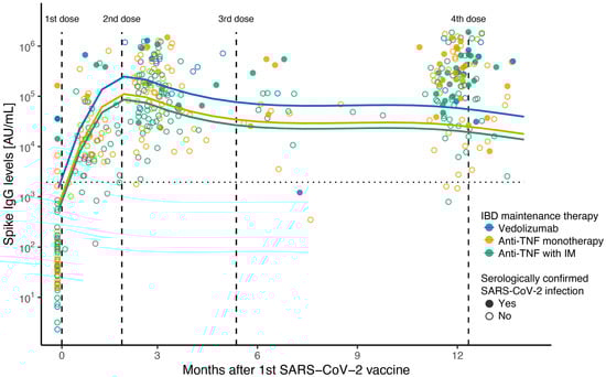 Figure 1. Scatterplot of anti-SARS-CoV-2 spike ancestral IgG levels after first dose of SARS-CoV-2 vaccine. Scatterplot of anti-SARS-CoV-2 spike IgG concentration (AU/mL) on a log10 scale, with fitted values from linear mixed-effects regression including a spline term for months after first vaccination. Therapy group at time of first SARS-CoV-2 vaccine: blue for vedolizumab; green for anti-TNF combined with immunomodulator; yellow for anti-TNF monotherapy. Solid circles show serologically confirmed SARS-CoV-2 infection samples; open circles show negative serology samples. Vertical lines indicate median time in days in which 2nd, 3rd, and 4th vaccines were received after 1st dose (57, 157, and 370 days, respectively). Horizontal line indicates seroconversion cut-off value (1960 AU/mL) for the Meso Scale Discovery assay.