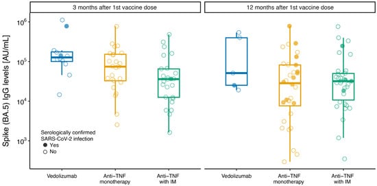 Figure 2. Box plots of anti-SARS-CoV-2 spike BA.5 IgG levels at 3 and 12 months after first dose of SARS-CoV-2 vaccine. Box plots of anti-SARS-CoV-2 spike (BA.5) antibody concentration (AU/mL) by therapy group according to IBD medication at time of first SARS-CoV-2 vaccine administration: “anti-TNF with IM” for anti-TNF (infliximab or adalimumab) combined with immunomodulator (azathioprine or methotrexate); “anti-TNF monotherapy” for anti-TNF (infliximab or adalimumab) monotherapy; “vedolizumab” for vedolizumab monotherapy or combination. The central line indicates median values, the boxes show the inter-quartile range (IQR), and the whiskers include the full range of values. Solid circles show serologically confirmed SARS-CoV-2 infection samples; open circles show serology-negative samples.