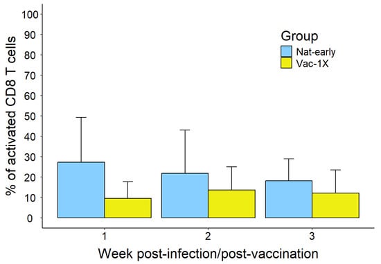 Our results showed that during the first week of the early immune response, SARS-CoV-2 natural infection (Nat-early) induced, on average, almost a 3-fold higher percentage of activated CD8+ T cells (27.26 ± 21.94%, average ± stdv) compared to vaccinees that have received the first vaccine dose (Vac-1X) (9.54 ± 8.23%); however, when we applied a GLS model followed by Tukey’s multiple comparison test, we observed that this difference was not statistically significant, probably due to variations inside the groups and the low number of samples analyzed. During the second and third weeks of the early immune response, the difference in the percentage of activated CD8+ T cells between Nat-early and Vac-1x decreased (week 2: Nat-early = 21.90 ± 21.08% and Vac-1X = 13.64 ± 11.46%; week 3: Nat-early = 18.30 ± 10.71% and Vac-1X = 12.13 ± 11.39%) (Figure 1).