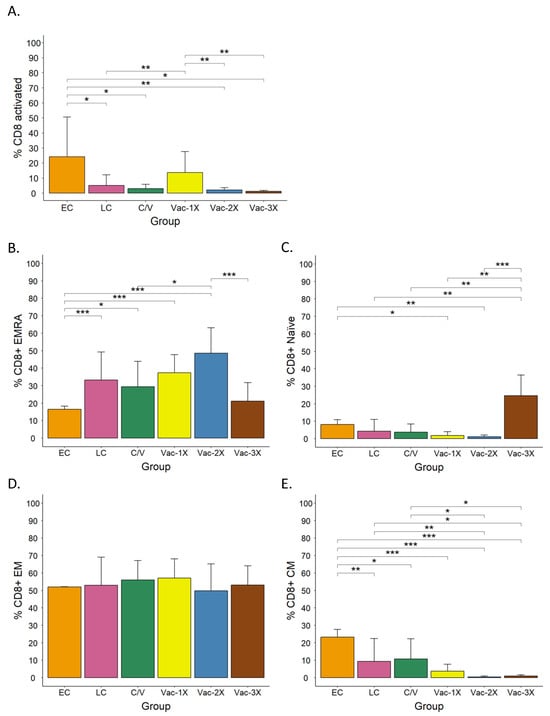 Figure 2. CD8+ T-cell activation and memory profiles in convalescent and mRNA-vaccinated patients 4 weeks after the onset of symptoms or vaccination. (A) Activation of bulk CD8+ T cells in early convalescence (EC), late convalescence (LC), convalescence-vaccinated (C/V), vaccinated with one (Vac-1X), two (Vac-2X) or three (Vac-3X) vaccine doses. (B) Percentage of CD8+ EMRA, (C) Naïve, (D) EM, and (E) CM T cells in the different groups. EMRA, effector memory cells re-expressing CD45RA; EM, effector memory; CM, central memory. A generalized least square (GLS) model with dummy variables, followed by Tukey’s multiple comparison test, was used for statistical analysis. * p < 0.05, ** p < 0.01, and *** p < 0.001.