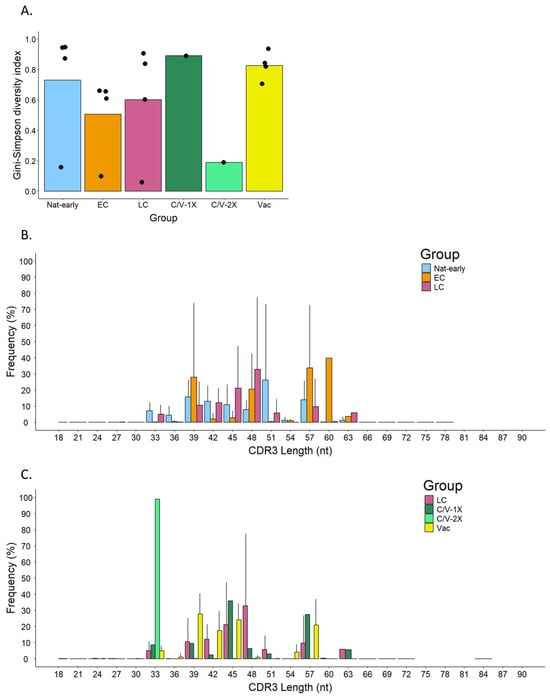 When we compared the length and frequency of the CDR3 regions between groups (Figure 3B,C), we observed that EC patients had a higher frequency of longer CDR3 regions (a peak of frequency of 39.88% at 60 nt) compared to Nat-early (26.32 ± 46.90% frequency peak at 51 nt) and LC patients (32.91 ± 44.28% frequency peak at 48 nt). Interestingly, the Vac group had the higher frequency peak (27.83 ± 12.51%) at a shorter length (39 nt) compared to the naturally infected groups. Although the length range in the LC and Vac groups was similar to the one in the other groups (lengths from 18 to 72 nt and 18 to 84 nt, respectively), the LC group presented some larger CDR3 regions (~63 nt) that were absent in the Vac group. Interestingly, when comparing LC to C/V-1X or C/V-2X, we observed that while LC and C/V-1X had similar frequencies and distribution of the CDR3 length, the C/V-2X sample had a unique CDR3 length of 33 nt in 98.84% of the cells. This unique length of CDR3 in the C/V-2x group is in concordance with the Gini–Simpson index observed in this patient (Figure 3A), which suggested low diversity.