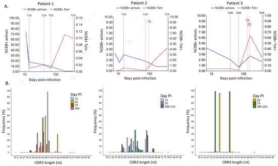 Figure 4. Comparison over time of the profiling of CD8+ T cells in the different patient samples. (A) Evolution along the time of the percentage of active CD8+ T cells and SARS-CoV-2-specific CD8+ T cells. Dotted black vertical lines in the graph mark the time points used for TCR sequencing. Patient 1: days 14, 42, 70, and 364 PI; Patient 2: days 15, 74, and 368 PI; Patient 3: days 39, 70, and 364 PI. Dotted red vertical lines mark the time point of the first vaccination (1X) and second vaccination doses (2X). (B) Frequency of different CDR3 length distributions in the number of nucleotides (nt) at a time point. Day PI = days post-infection. (B) CDR3 length distribution for different time points. Day PI = days post-infection. 1X = one vaccination dose, 2X = two vaccination doses.