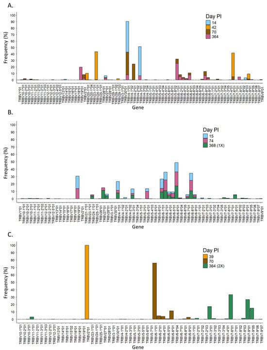 Figure 5. Evolution over time of the usage of the V gene in the different patients. Usage of TRBV genes at different time points in patients 1 (A), 2 (B), and 3 (C). PI = post-infection.