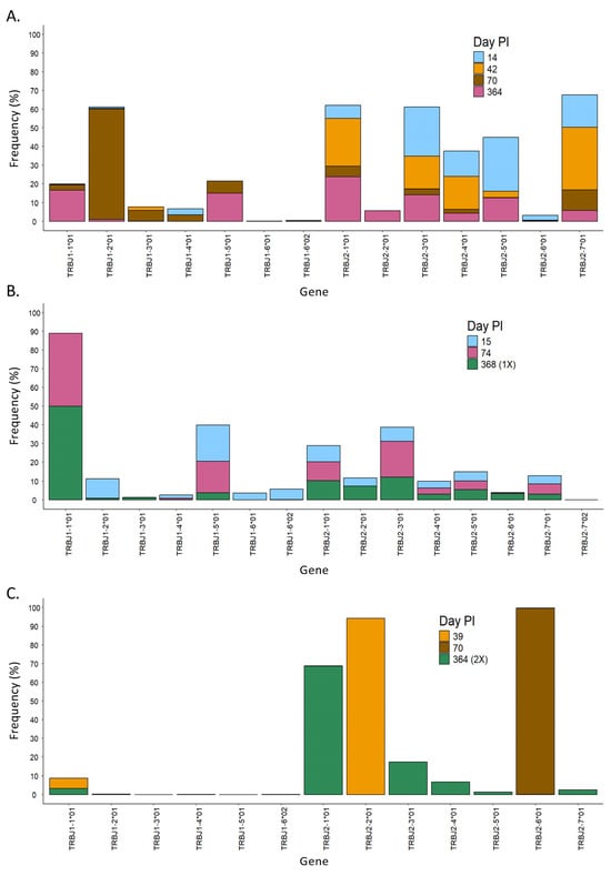 Figure 6. Evolution over time of the usage of the J gene in the different patients. Usage of TRBJ genes at different time points in patients 1 (A), 2 (B), and 3 (C). PI = post-infection.