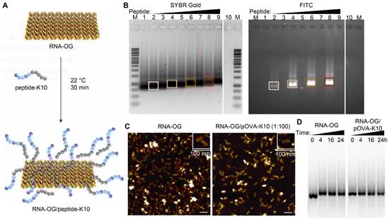Structure and stability of RNA-OG/peptide-K10 complex. (A) Schematic of RNA-OG/pOVA-K10 peptide assembly from RNA-OG and polylysine-linked peptides (peptide-K10). (B) Agarose gel electrophoresis analysis of RNA-OG/pOVA-K10 at different ratios. SYBR Gold staining (left) and FITC fluorescence imaging (right) of 1. RNA-OG; 2–9. RNA-OG/pOVA-K10 at an RNA-OG:pOVA-K10 ratio of 1:50 (2–3), 1:100 (4–5), 1:150 (6–7), 1:200 (8–9), using either pOVA-K10 (3, 5, 7, 9) or FITC-pOVA-K10 (2, 4, 6, 8); 10. FITC-pOVA-K10. Bands of the corresponding samples are highlighted by the same color box. M denotes 1kb DNA marker. (C) AFM imaging of RNA-OG and RNA-OG/pOVA-K10 at a 1:100 ratio. (D) Agarose gel electrophoresis analysis of RNA degradation in 10% serum. RNA-OG or RNA-OG/pOVA-K10 (1:100) was incubated in 10% mouse serum for 4, 16, or 24 h at 37 °C.