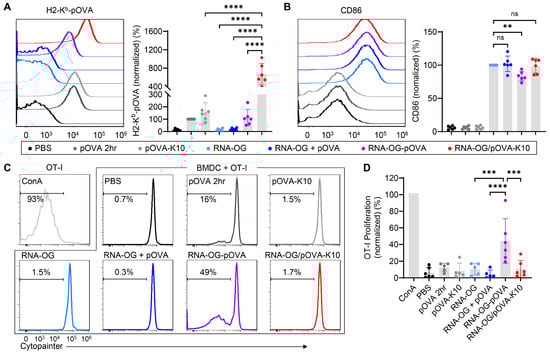 BMDCs were stimulated as previously described [20]. After harvesting, BMDCs were seeded at 5 × 105 cells/well in a 12-well plate for a density of 5 × 105 cells/mL in primary cell culture media + PMB (25 μg/mL). Cells were then treated with PBS, pOVA-K10 (5 μM), RNA-OG (0.05 μM, 33 μg/mL), RNA-OG (0.05 μM) + pOVA (5 μM), RNA-OG-pOVA (0.05 μM:~0.65 μM), or RNA-OG/pOVA-K10 (0.05 μM:5 μM) and incubated for 18–20 h at 37 °C. pOVA (5 μM) was added during the last 2 h of incubation as a peptide pulse positive control. After stimulation, cells were gently washed with RPMI/CM (3x) and co-cultured with OT-I splenocytes or were harvested, washed, and stained using anti-H2-Kb/pOVA (BioLegend, San Diego, CA, USA) and anti-CD86 (Tonbo, Fremont, CA, USA) fluorescent antibodies. Stained cells were analyzed via flow cytometry, and the MFI for each treatment was normalized against the positive controls.