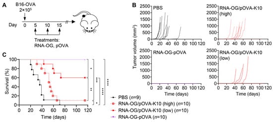Therapeutic efficacy of RNA-OG/pOVA-K10 (low or high peptide) vaccines. (A) Treatment schedule. Mice engrafted with 2 × 105 B16-OVA (s.c., flank) were treated with PBS, physically assembled RNA-OG/pOVA-K10 (1:13 or 175), or covalently linked RNA-OG-pOVA (1:~13) on days 5, 10, and 15 (s.c., flank) after tumor inoculation. (B) Tumor growth and (C) survival of mice following tumor administration were monitored. Data is compiled from two replicate experiments (n = 9–10). Kaplan–Meier statistical analysis was used to compare each treatment group. * Indicates p < 0.05, ** indicates p < 0.01, *** indicates p < 0.001, and **** indicates p < 0.0001.