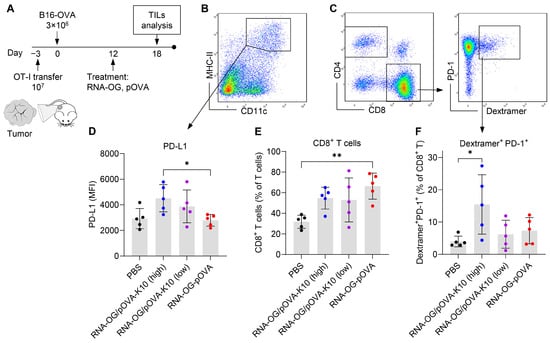 TILs assessment following treatment with RNA-OG peptide vaccines. (A) Experiment schedule. Mice adoptively transferred with OT-I splenocytes (107, i.p.) were engrafted with B16-OVA tumors (3 × 106, s.c.) and then treated with PBS, RNA-OG/pOVA-K10high, RNA-OG/pOVA-K10low, or RNA-OG-pOVA (s.c.). Five to seven days later, tumors were isolated, and TILs were analyzed via flow cytometry. (B,C) Representative flow cytometry gating of (B) DCs from CD45+ leukocytes and (C) T cell distribution among CD3+ T cells in the tumor. Pseudocolor density plot where red represents high cell density and blue represents low cell density. (D) PD-L1 expression in MHC-II+ DCs. (E) Distribution of CD8+ T cells. (F) Percentage of H2-Kb/pOVA dextramer+PD-1+ CD8+ T cells. One-way ANOVA with multiple comparisons was used for statistical analysis (n = 5). * Indicates p < 0.05 and ** indicates p < 0.01.