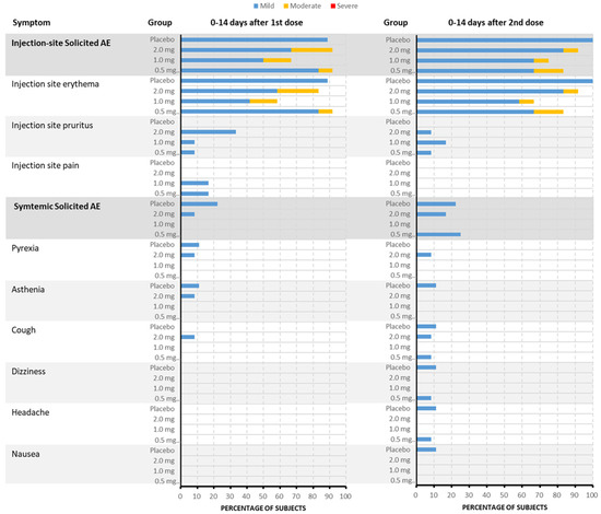 The incidence and severity of solicited TEAEs after each dose in each group (by PT). Within the vaccine group, the most frequently reported injection-site adverse events were erythema at the injection site (83.3%), pruritus (22.2%), and pain (11.1%). Among the 45 subjects included in the Safety Set, about 41 subjects (91.1%) experienced solicited TEAEs. When judged by the most severe grade, about 34 subjects (75.6%) experienced grade 1 events and 7 other subjects (15.6%) experienced grade 2 events. The incidence of solicited TEAEs in the 1.0 mg vaccine group was 83.3%, which was lower than that in the 0.5 mg vaccine group, 2.0 mg vaccine group, and placebo group, in which the incidence of solicited TEAEs was 91.7%, 91.7%, and 100.0%, respectively. Additionally, systemic solicited adverse events were reported in 25.0% of subjects in the 0.5 mg group, 0% in the 1.0 mg group, 16.7% in the 2.0 mg group, and 33.3% in the placebo group. The systemic adverse events primarily included fever (5.6%), cough (5.6%), asthenia (2.8%), dizziness (2.8%), and headache (2.8%) within the vaccine group.