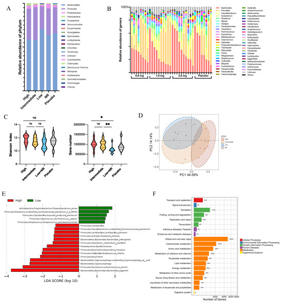 Differences in microbiome structure, beta diversity, alpha diversity, and bacterial species from baseline of vaccination. (A) Bacteroidetes and Firmicutes were dominant phylum in health vaccinee’s gut microbiome. (B) Composition of microbiome on genus level indicated individual differences in gut microbiota. (C) Alpha diversity varied between different vaccine response groups at baseline. The values were considered as follows: ns, non-significant. *, p < 0.05, **, p < 0.01 (D) Beta diversity at genus level was significantly different between high-response and low-response group at baseline (high, n = 9; low, n = 7). Principal component analysis (PCA) ordinations were used to visualize clustering of patients based on their species-level compositional profiles. (E) Differentially abundant species between high- and low-response groups detected using LDA Effect Size (LEfSe) analysis. (F) Functional pathway enriched in high-response vaccinee’s gut microbiome.