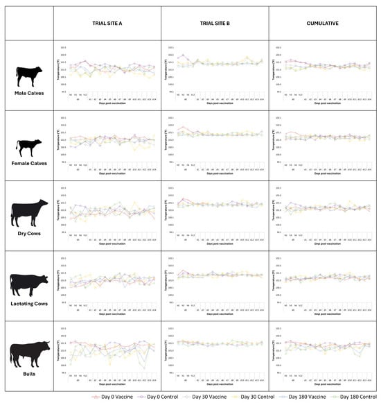 Mean body temperatures have been shown in Figure 2 for comparison. Most groups of animals showed a transient increase in body temperature during the first 24 h following vaccination; this increase was higher after the first dose of the vaccine as compared to the two subsequent doses of the vaccine. At Site A, all groups, viz. male calves (p << 0.01), female calves (p << 0.01), dry cows (p = 0.04), lactating cows (p = 0.04), and bulls (p << 0.01), showed a significant increase in body temperature post-vaccination. At Site B, male calves (p = 0.02), dry cows (p = 0.01), and bulls (p << 0.01) showed a significant increase in body temperature post-vaccination. Cumulatively, significant rises in body temperature post-vaccination were observed in male calves (p << 0.01), female calves (p << 0.01), and bulls (p << 0.01); within calves, the rise was greater in males than in females. Between sites, the corresponding group at Site A showed a greater increase in body temperature post-vaccination than the group at Site B (p << 0.01). However, at both Sites A and B, the body temperature of all subjects remained well below 102.5 °F at all the observation time-points.