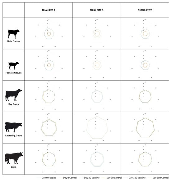 The trial was replicated at two sites across five physiological groups. The trial sites differed markedly in geoclimatic conditions, the genetic makeup of the animals, the characteristics of the breeds, and the farm practices. Animals at Site A consisted entirely of stall-fed Deoni breeds [55] of Indian cattle. Animals at Site B comprised almost equal numbers of Vechur breed [56] of Indian cattle and crossbreds (non-descript × HF/Jersey), reared under mixed farming, where the animals were stall-fed but also allowed to graze in open grasslands. The trial did not aim to establish breed differences in the reaction and response to the vaccine, but animals of different breeds and physiological statuses reared under contrasting geoclimatic and management conditions were included in the study so that the results of the trial were representative of, and could be generalized to, various types of cattle and rearing conditions. Internationally, IBR vaccines are recommended for use at six-month intervals following primary vaccination with two doses. Hence, the duration of the present trial was also kept at 210 days, including six months of assessment of the immune response following primary vaccination and another month following revaccination.