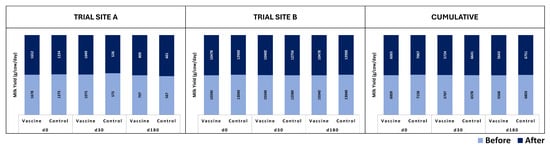 Milk yield in the lactating cows for 5 days before and 9 days after vaccination was compared to evaluate the impact of the vaccine on milk production (Figure 4). At Site A, the mean milk yield per cow per day over five days before the first dose of primary vaccination was 1678 g, and over nine days following vaccination was 1652 g. With the second dose of primary vaccination, the mean milk yield per cow per day over five days before vaccination was 1075 g, and over nine days following vaccination was 1049 g, respectively. Three (03) animals in the vaccine arm became dry by this time-point. With the third dose, i.e., revaccination, the mean milk yield per cow per day over five days before vaccination was 797 g, and over nine days following vaccination was 809 g, respectively. Four (04) animals in the vaccine arm became dry by this time-point. At Site B, the average daily milk yield per cow was recorded to be greater in the treatment arm after (10,478 g) than before (10,340 g) the first vaccination. Similarly, the average daily milk yield per cow was again recorded to be greater in the treatment arm after (10,478 g) than before (10,340 g) the third vaccination. These differences in the milk yield before and after vaccination were not statistically significant at Site A (p = 0.19), Site B (p = 0.54), or cumulatively (p = 0.70).