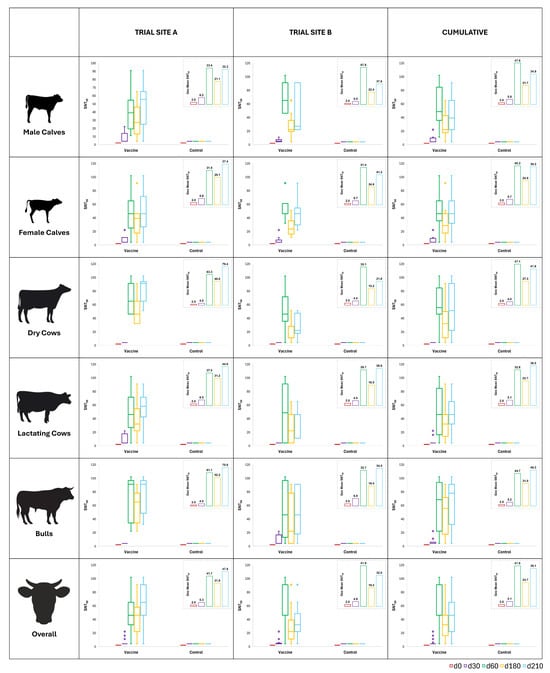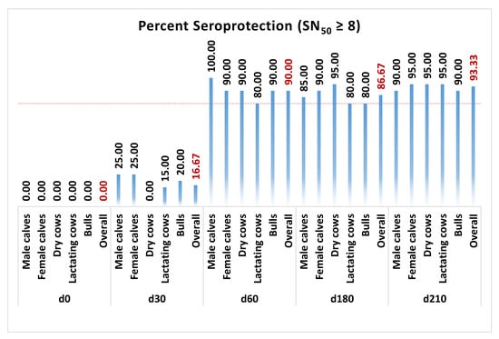 Antibody titers of all five groups of animals, i.e., male calves, female calves, non-lactating cows, lactating cows, and breeding bulls, were determined on days 0, 30, 60, 180, and 210 of the trial (Figure 5). Following both doses of the primary vaccination at days 0 and 30, the geometric means of SNT50 in the treatment arms of all groups surpassed 8. Further, these titers persisted above 8 until revaccination, with the third dose on day 180. At Site A, three of the forty-five animals in the vaccine arm did not respond to the vaccine. Similarly, at Site B, two of the forty-five animals in the vaccine arm did not respond to the vaccine. One of forty-five animals at Site A and three of forty-five animals at Site B responded late only upon receiving revaccination with the third dose of the vaccine. In comparison, all control subjects at both trial sites showed SNT50 lower than 2 throughout the study until day 210. Overall, the percentage of subjects meeting or exceeding SNT50 ≥ 8 was 90.00%, 86.67%, and 93.33% on days 60, 180, and 210 of the trial, respectively (Figure 6).