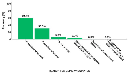 In relation to the responses of those who had been vaccinated or intended to be vaccinated (19,872 individuals), the primary motivation was personal protection against the risk of infection (n = 11,861, 63.3%). Additionally, 740 participants (4.0%) were motivated by endorsements related to work, gym attendance, or university activities (Figure 1).