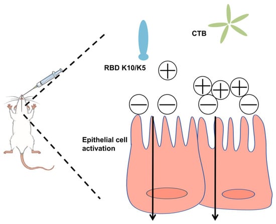 Following mucosal immunization in mice, our observations indicated that the mere addition of K10 to the RBD did not significantly enhance its immunogenicity, as depicted in Figure 3B. This lack of enhancement may be attributed to the relatively small molecular weight of the RBD, even with the inclusion of K10, which could result in rapid in vivo clearance or inefficient uptake and processing by APCs. Such limitations may restrict its ability to induce a robust humoral and mucosal immune response. In contrast, the incorporation of the CTB as a mucosal adjuvant significantly augmented the vaccine’s immunogenicity. Notably, the RBD with K10 elicited a more potent immune response. CTB is well-established as an effective mucosal adjuvant, known for its capacity to enhance antigen delivery and stimulate both mucosal and systemic immune responses. It facilitates antigen uptake by binding to GM1 ganglioside receptors on epithelial cells and APCs, thereby promoting antigen presentation and the activation of immune cells such as DCs and B cells [28]. We hypothesis that the enhanced immunogenicity of RBD-K10/K5 is due to improved mucosal uptake and/or APC activation, which indicates that positively charged antigens facilitate electrostatic interactions with negatively charged cell surfaces, thereby promoting uptake and immune activation [27,29]. There may be a synergistic interaction between K10 and CTB, K10/K5’s positive charge enhancing CTB’s mucosal adhesion or influencing APC signaling.
