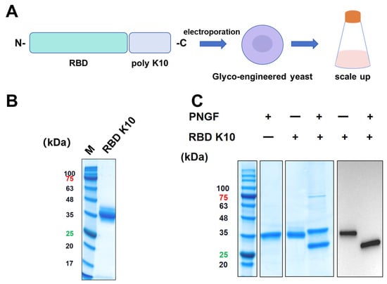 Illustrates the design, expression, and analysis of the recombinant RBD K10 protein. (A) Schematic representation of the recombinant RBD K10 construct. A poly-lysine (K10) tag is fused to the receptor-binding domain (RBD) at the C-terminus. The construct was introduced into glycoengineered Pichia pastoris via electroporation. Positive clones were subsequently screened and subjected to scale-up cultivation. (B) SDS-PAGE analysis of the purified RBD K10 protein. The molecular weight marker (M) is shown on the left, and the purified RBD K10 protein appears as a single major band. (C) SDS-PAGE and Western blot analysis of the undigested or PNGF-digested RBD K10 protein. These numbers indicate the molecular weights of proteins, with red indicating a protein molecular weight of 75 kDa and green indicating a molecular weight of 25 kDa.