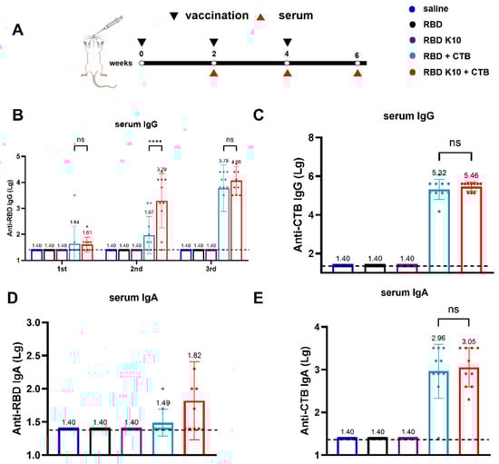 Immunogenicity evaluation of RBD K10 and its combination with and without cholera toxin B subunit (CTB) in mice following pulmonary delivery. (A) Experimental timeline depicting vaccination (black triangles) and serum collection (red triangles) over a 6-week period. Mice were immunized via pulmonary delivery with saline, RBD, RBD K10, RBD + CTB, or RBD K10 + CTB. (B) Serum anti-RBD IgG levels at weeks 2, 4, and 6. (C) Anti-CTB IgG levels in serum at week 6. (D) Serum anti-RBD and (E) anti-CTB IgA levels at week 6. (n = 10). not significant difference (ns) p > 0.05; **** p < 0.0001.