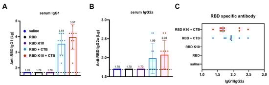 IgG1 and IgG2a, which are subclasses of IgG, are differentially regulated by T-helper cell cytokines. The Th2 cytokine IL-4 stimulates B-cell production of IgG1 while concurrently suppressing IgG2a secretion. Conversely, the Th1 cytokine IFN-γ promotes IgG2a synthesis and inhibits IgG1 production. The distinct functions of IgG1 and IgG2a illustrate the immune system’s ability to balance antibody responses (IgG1) with inflammatory responses (IgG2a), thereby enabling a tailored defense mechanism against various pathogens [24]. In the group immunized with RBD + CTB, IgG1 antibody titers reached 3.47 × 103 (Figure 4A), while IgG2a titers were 1:98 (Figure 4B). In contrast, the RBD K10 + CTB group demonstrated higher titers, with IgG1 at 9.33 × 103 and IgG2a at 1.20 × 102. In the RBD K10 + CTB group, the serum IgG1/IgG2a ratio approximated 1, suggesting a predisposition towards cellular immunity (Figure 4C). These findings indicate that the combination of RBD and CTB effectively induces a diverse antibody response, predominantly IgG1. Moreover, when compared to the native RBD, the modified RBD K10, in conjunction with CTB, elicits a more robust immunostimulatory effect, enhancing both IgG1 and IgG2a antibody titers.